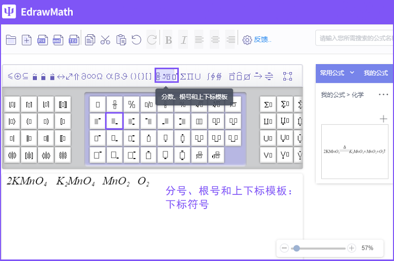 2、在编辑区输入化学公式。将输入法切换到英文输入法,使用键盘输入数字和元素字符,注意区分公式元素符号的大小写;由于化学公式中存在下标等特殊符号,在输入公式元素符号时要注意利用功能栏中的【分号、根号和上下标模板】选项,这样就将分子式2KMNO4、K2MNO4、MNO2、O2这些字符快速输入到编辑区(如图)。