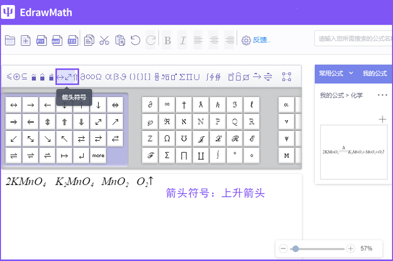 3、添加上升箭头符号。先将光标点一下O2右侧,然后选择功能栏中的【箭头符号】,在该选项下找到并选择上升箭头符号即可。
