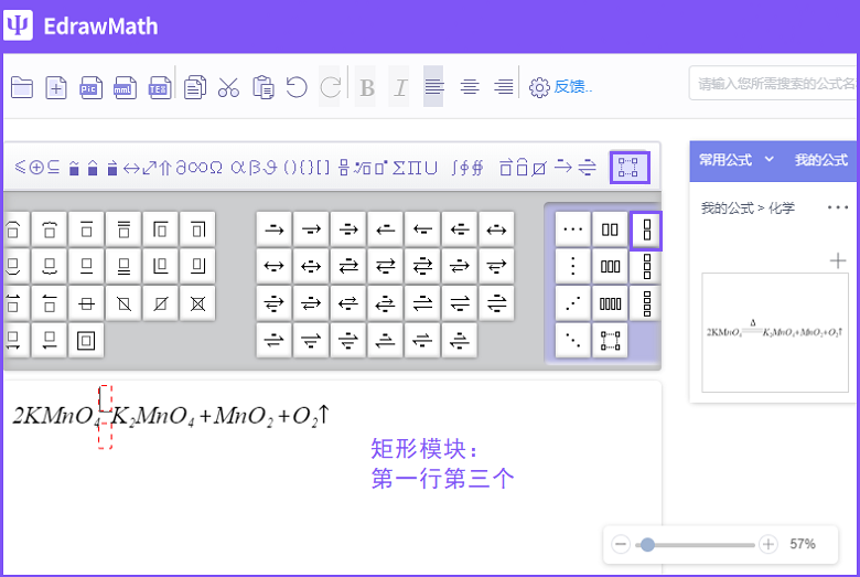 4、插入矩形方框。用光标点击分子式2KMNO4和K2MNO4的中间位置,在功能栏选择【矩形模板】,插入需要的矩形方框(如图)。