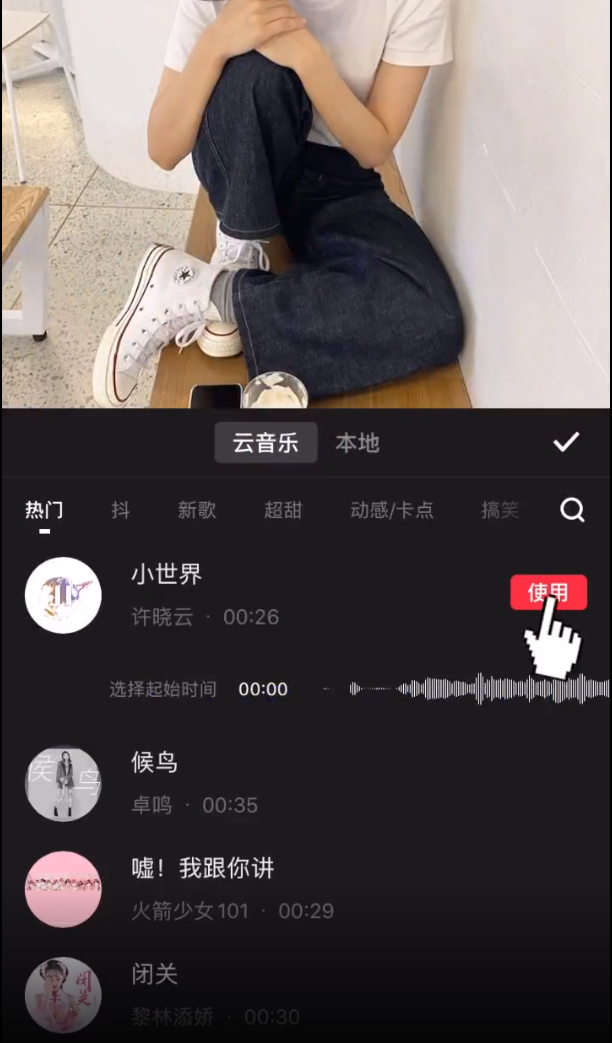 4、在云音乐或本地音乐库中,选择一个合适音乐,点击音乐右侧的【使用】,讲音乐添加到音乐轨。