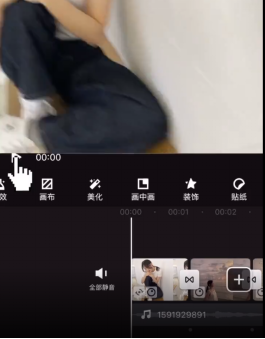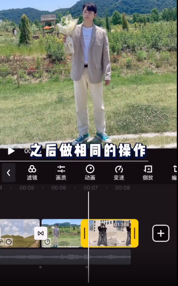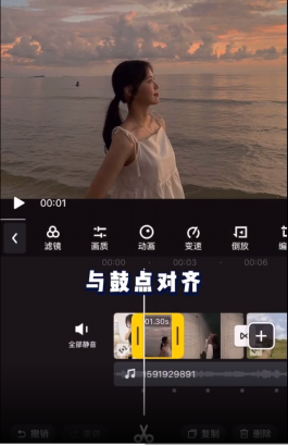 7、点击选中第一个素材,按住该图片或视频右边缘(如图),左右拖动调整图片或视频时长,使图片或视频时长与鼓点对齐。