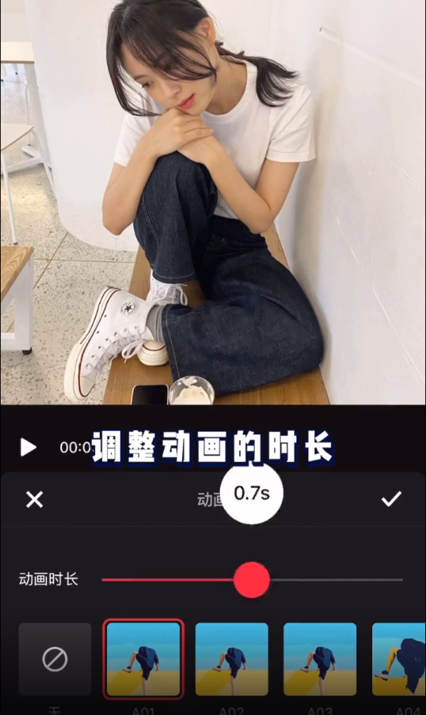 11、拖动“动画时长”一栏中的圆点,调整动画时长到合适位置,然后点击【√】确认选择。