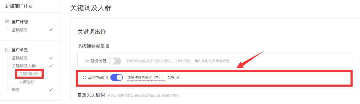 3、如果用户选择自定义推广的方式,那么就点击推广单元中的“关键词出价”,并在其右侧的界面中开启“流量拓展包”,再设置拼多多流量拓展包出价的具体数值。