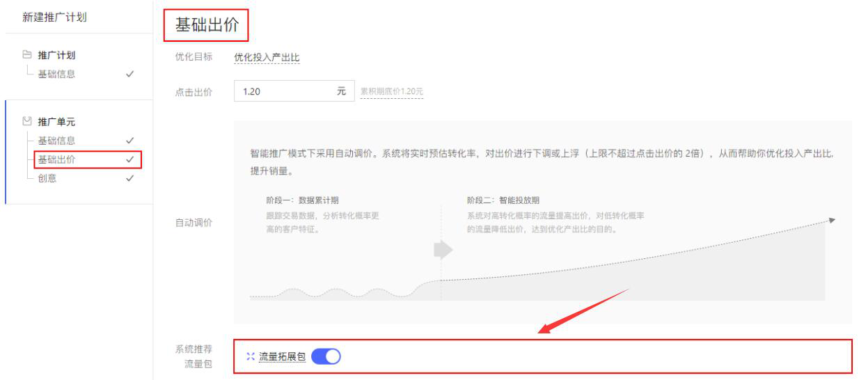 4、用户也可以选择智能推广的方式。在拼多多推广单元中点击“基础出价”,并在其右侧界面中的系统推荐流量包中开启“流量拓展包”,设置拼多多流量拓展包点击出价的数值。
