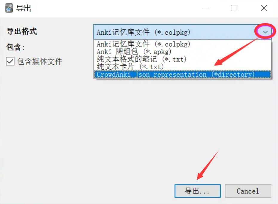 2、然后,通过Anki的文件菜单打开“导出”的页面。在导出格式一栏中选择用插件的方式导出,如下图所示,点击“导出”的按钮。