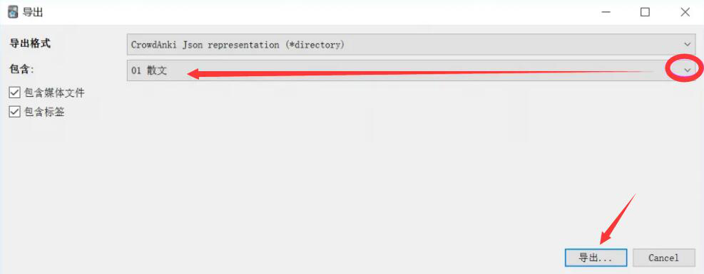 3、在“导出”的窗口中,选择自己希望用记乎转换的Anki卡包,点击“导出”按钮。