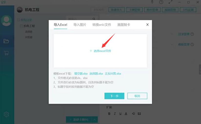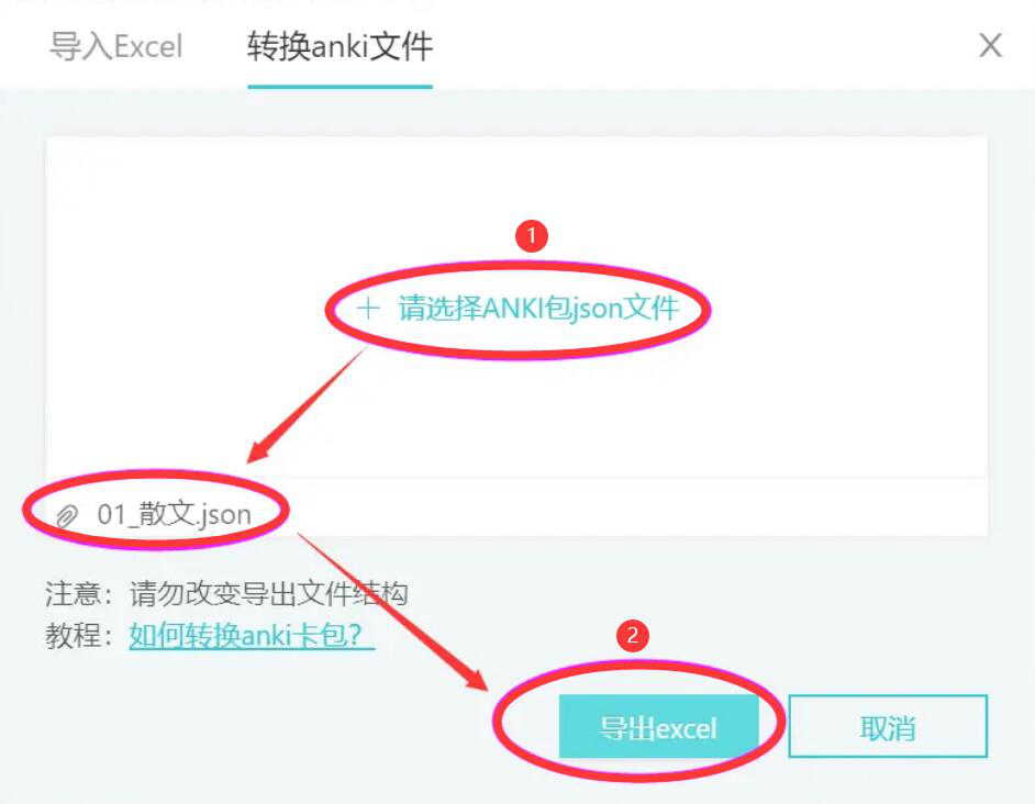 7、最后,点击“+选择excel文件”将已经更换了格式的Anki卡包导入进来,记乎转换Anki卡包就完成了。