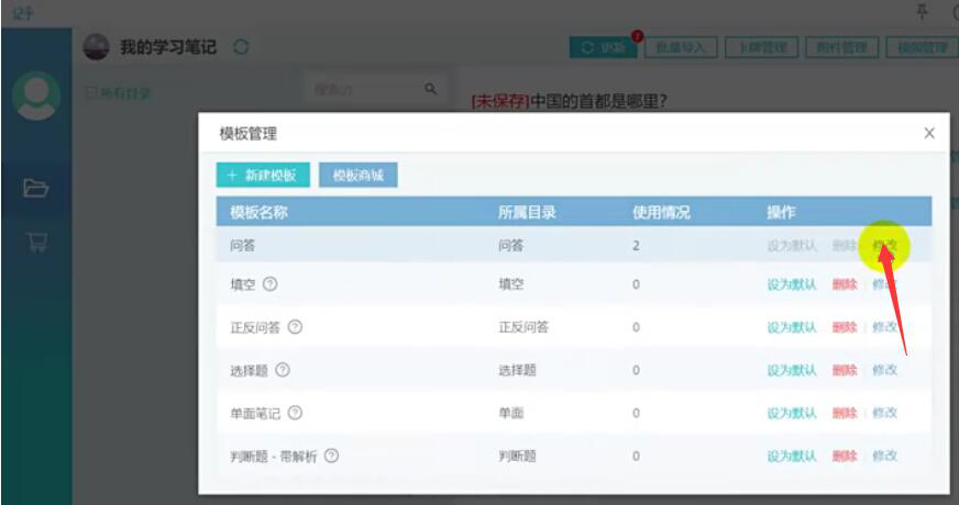 2、然后,在记乎电脑端的“模板管理”页面中,找到自己原来制作的卡片包的模板,点击“修改”,从而进入卡编器快捷修改样式的下一步操作。