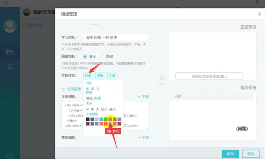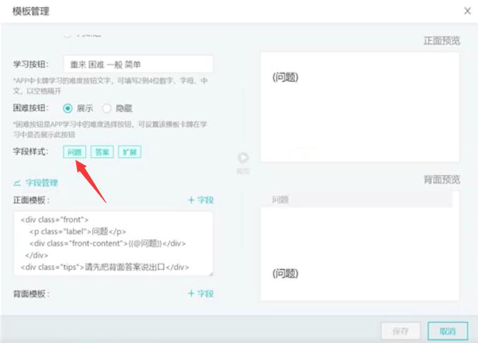3、在记乎电脑端的模板管理设置页面中,找到“字段样式”,并点击“问题”按钮。