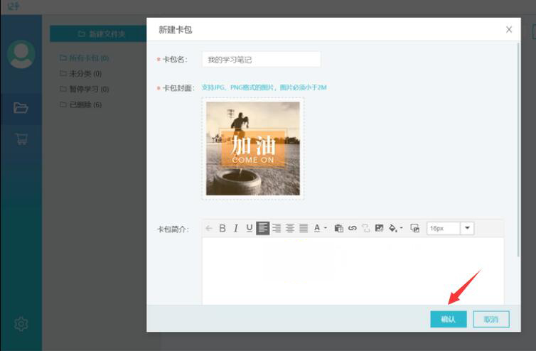 2、此时,记乎便会弹出新建卡包的页面。在该页面中,用户根据需要输入卡包名和选择卡包的封面,并点击“确定”按钮。其中,卡包简介一栏可不填。