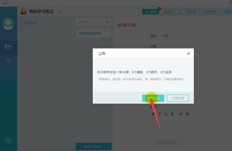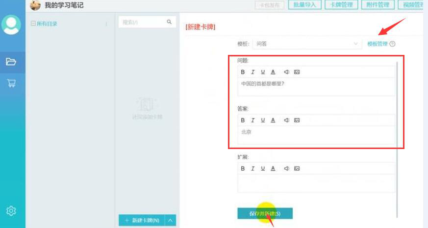 3、然后,在记乎的卡片编辑界面中,点击“模板管理”选择适合自己卡片用的模板。再输入问题、答案,点击“保存并新建”的按钮。
