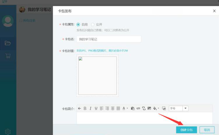 5、记乎便会弹出卡包发布的页面。它默认的是自用,如果用户希望将自己制作的记乎卡片我来教你给更多的记乎用户使用,就可以勾选“公开”,再点击“创建卡包”的按钮。