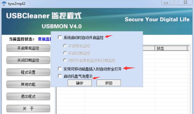 USBMON解除U盘保护的时候,虽然可以直接在USBMON的其他功能菜单中点击“移除写保护”来解除U盘的保护,但是为了U盘的安全使用,我们一般还会开启常规监控、日期监控,并将它设置开机自启,这样当USBMON检测到U盘写了保护时,就能快速解除U盘写保护了。