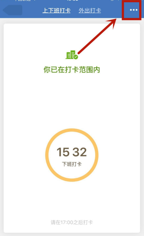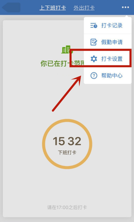 进入打卡服务窗口,点击右上角的【...】图标,弹出选项,点击选项【打卡设置】,