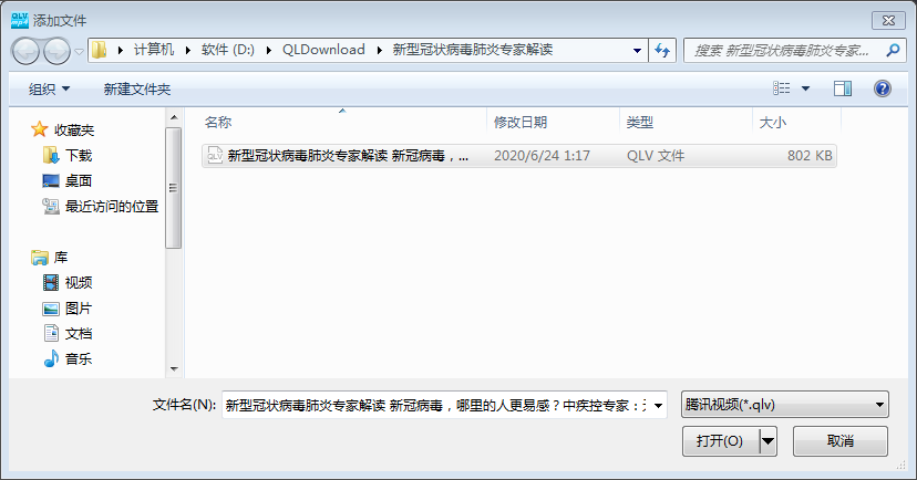 4、弹出“添加文件”窗口,浏览找到刚才下载qlv视频文件,点击窗口右下【打开】。