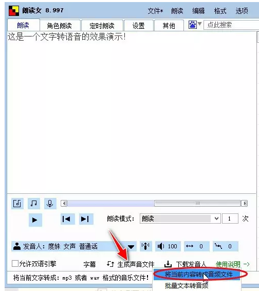 确认无误,最后点击【生成声音文件】按钮,选择【将当前内容转换成音频文件】,