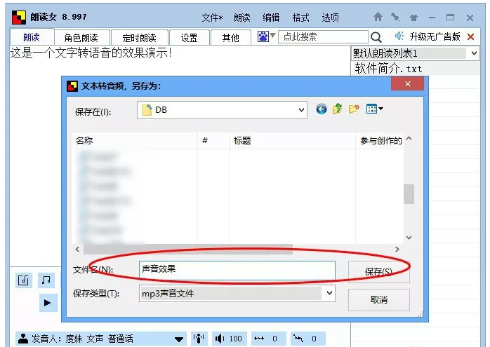 弹出对话框,如图,选择音频文件保存位置,设置文件名称和文件格式,点击【保存】,朗读女就会自动将文字转换成语音,非常方便。