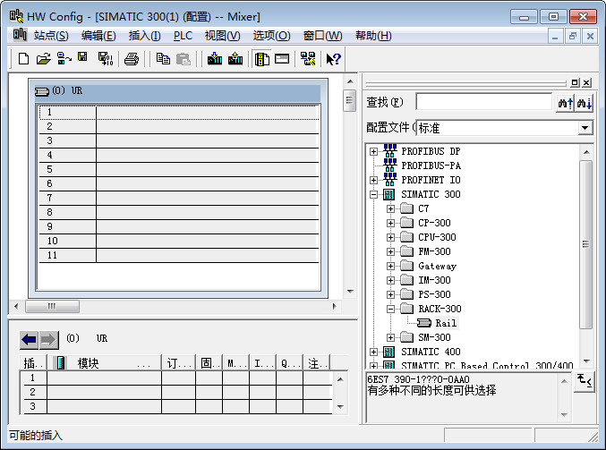 4、弹出硬件配置窗口,在右侧配置文件列表中依次点击【SIMATIC 300】—【RACK-300】,然后双击【RACK-300】展开列表中的【RAIL】,在左侧中间添加一个导轨。