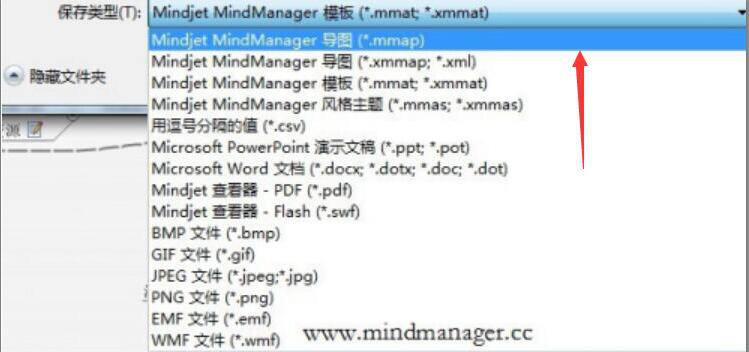 2、在弹出来的“另存为”窗口中,选择“Mindjet MindManager导图(*.mmap)”的保存类型。文件导出后,其他用户打开MindManager并导入该文件,通过大纲视图的视图模式便可以阐述他的个人观点了。