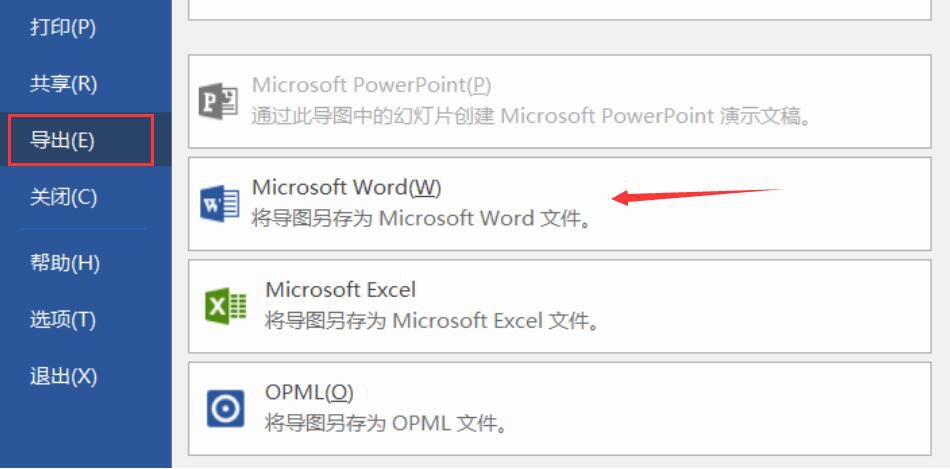 3、再跟大家说说如何使用MindManager导出Word文件。点击MindManager“文件”菜单中的“导出”选项,选择Word文档的方式。