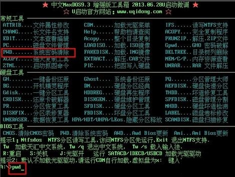 3、接下来会进入MaxDos工具箱界面,在【常规工具】一栏找到系统密码清除命令的代码,这里是【PWD】。然后在界面下方命令栏(即光标闪烁处)输入字符“PWD”,然后按回车键确认运行。