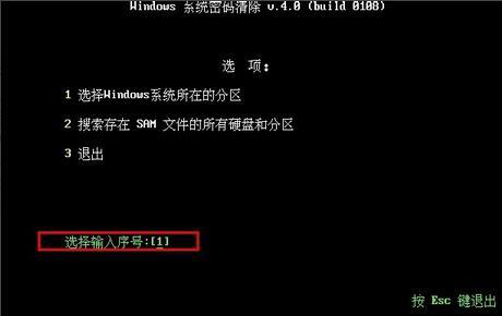4、进入Windows系统密码清除界面,在下方“选择输入序号”后的中括号内输入数字1,最后按回车键确认选择。