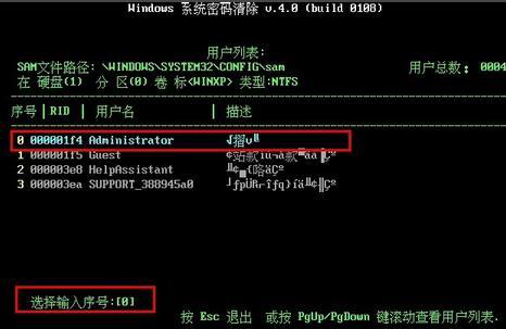 6、程序继续进行,会在下方罗列出系统盘包含的用户名和密码,在下方“选择输入序号”后面的中括号内输入序号0,即代表选择了列表中序号0对应的密码(如图),最后按回车键继续。