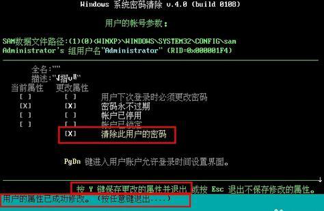 7、接着对选中账号密码进行操作:选中【清除此用户的密码】,然后按键盘上“Y”键保存更改并退出。等到下方出现提示“用户的属性已成功修改”,按任意键退出,系统密码就被清除了。