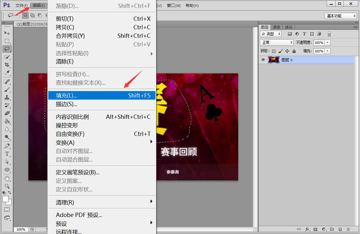 3、点击PS“编辑”菜单中的“填充”,从而继续进行去除复杂背景杂物的下一步操作。