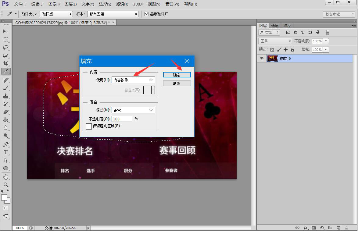 4、在弹出来的“填充”窗口中,选择使用“内容识别”的方式,并点击“确定”按钮。