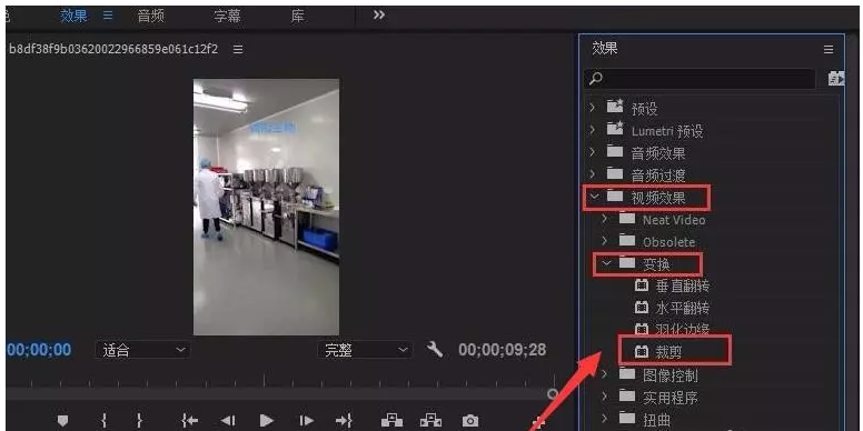 如果你想要调整视频画面尺寸,点击上方【效果】选项卡,在窗口右侧会出现效果栏,如图,选择【效果】——【视频效果】——【变换】——【裁剪】,