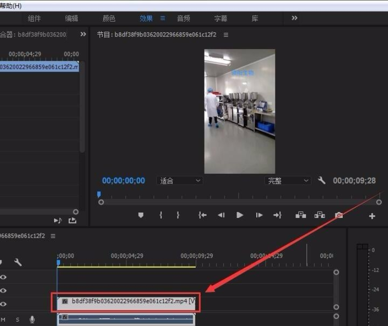 打开AdobePremiere软件,导入手机视频,如图,将视频素材向右拖动至时间轴,在编辑区进行处理,