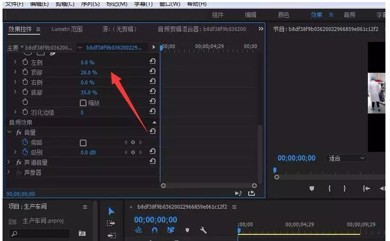 现在进行下一步操作,点击左上角的【效果控件】,选择【裁剪】,设置相关参数(左侧、顶部、右侧、底部),或者直接使用鼠标调整参数,从而改变视频画面大小,