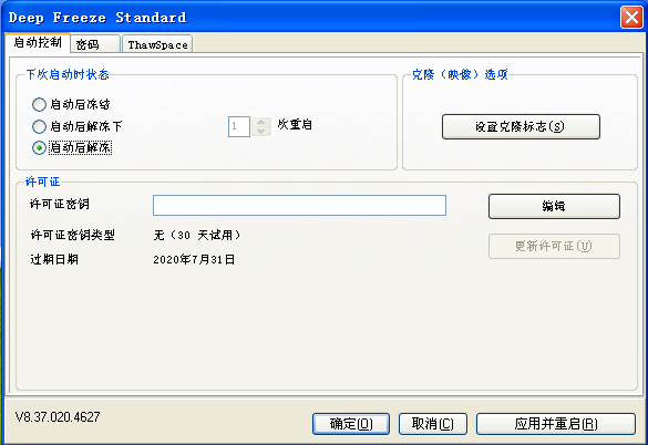 7、当然,如果确需对C盘进行更改,比如安装或删除软件,那么进入到冰点还原精灵主界面,勾选“启动后解冻”,然后点击【确定】或【应用后重启】,之后就可以解除对C盘的保护,更改C盘文件了!