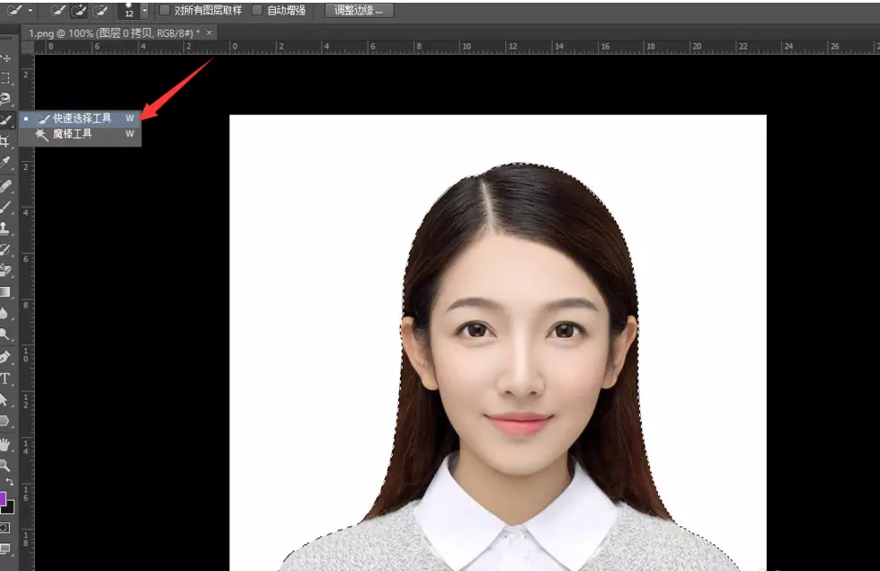 在PS工具栏中点击快速选择工具,利用该工具框选人物主体,如图所示,
