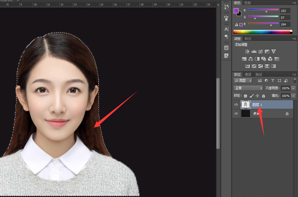 使用鼠标点击图层1,按下Ctrl键,选中选区,如图所示,