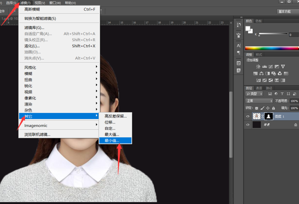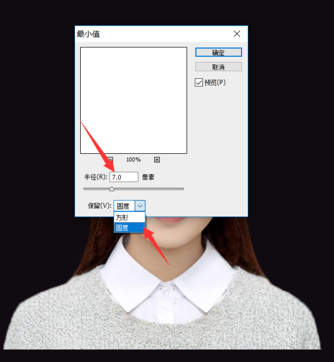 在PS软件上方菜单栏中点击【滤镜】——【其他】——【最小值】,出现弹窗,如图,设置半径为7.0像素,保留为圆度,点击确定,