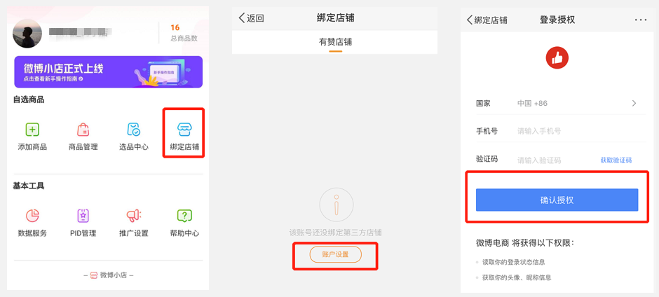 2、打开微博,进入微博小店,点击【绑定店铺】——【账户设置】,输入相关信息,点击【确认授权】,成功授权有赞店铺。