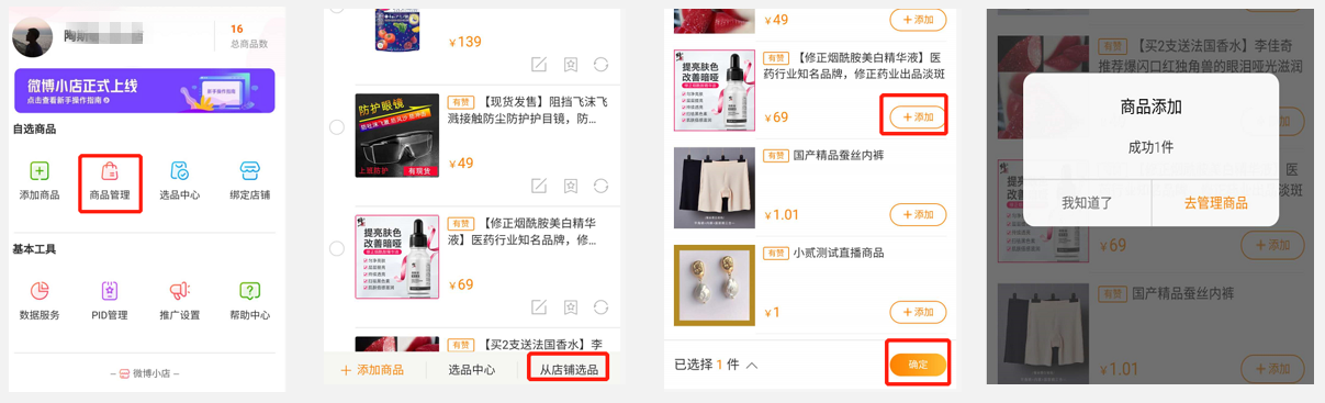 3、上架商品,进入微博小店,点击【商品管理】——【从店铺选品】,浏览商品,点击【添加】,最后点击确定,商品添加成功。