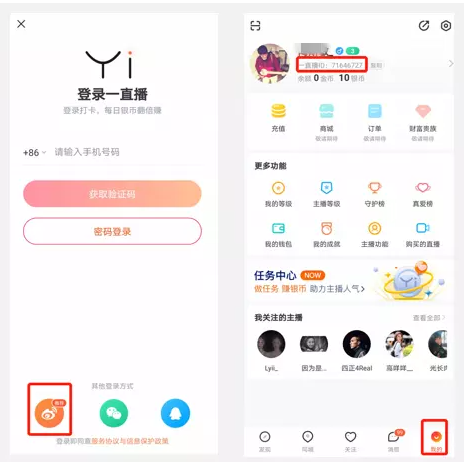 1、下载安装一直播APP,注册个人账号(使用微博登录),获取用户ID,