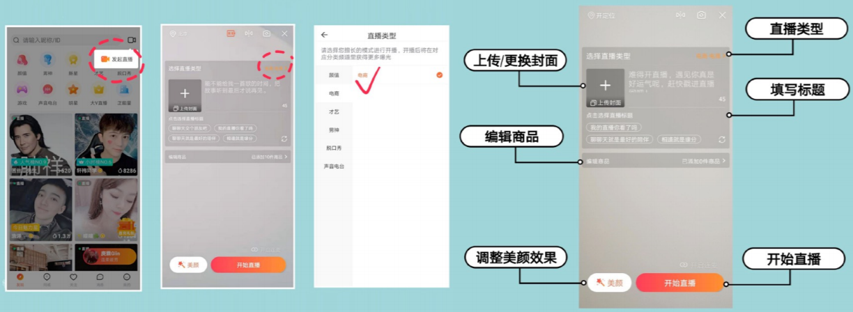 打开一直播APP,进入首页,点击【发起直播】按钮,进入开播设置页面,选择【直播类型】为电商,进行相关准备工作,包括上传封面、填写标题、编辑商品等,然后点击【开始直播】,即可售卖商品。