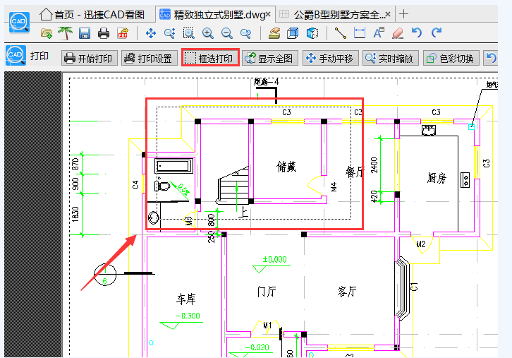 如图,点击【打印和预览】选项,进入图纸打印窗口,在上方选项栏可以看见多种打印设置,选择【框选打印】命令,选中图纸内容,最后点击【开始打印】即可。