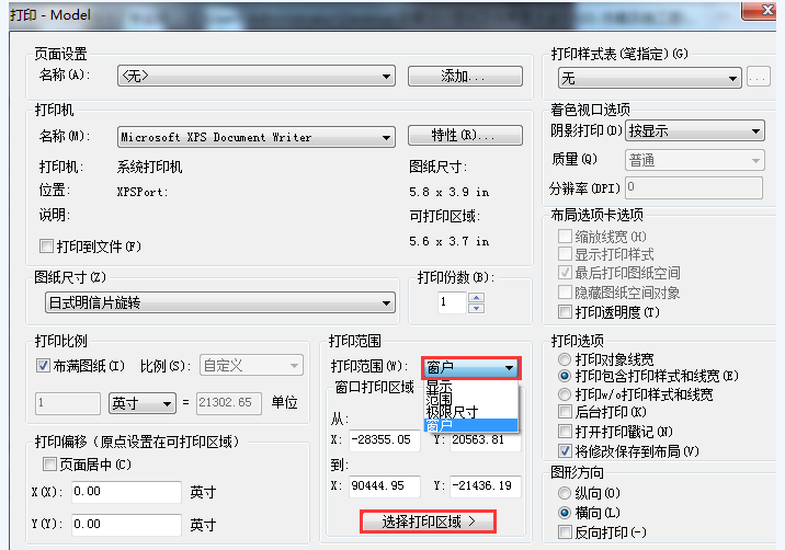 拖动鼠标选择需要打印的CAD图纸内容,选好之后,可以在【打印-Mode】窗口中进行打印设置,