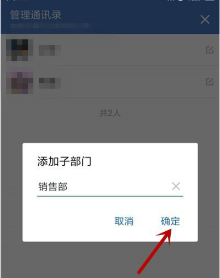 进入管理通讯录界面,点击下方【添加子部门】,然后设置部门名称,点击确定,