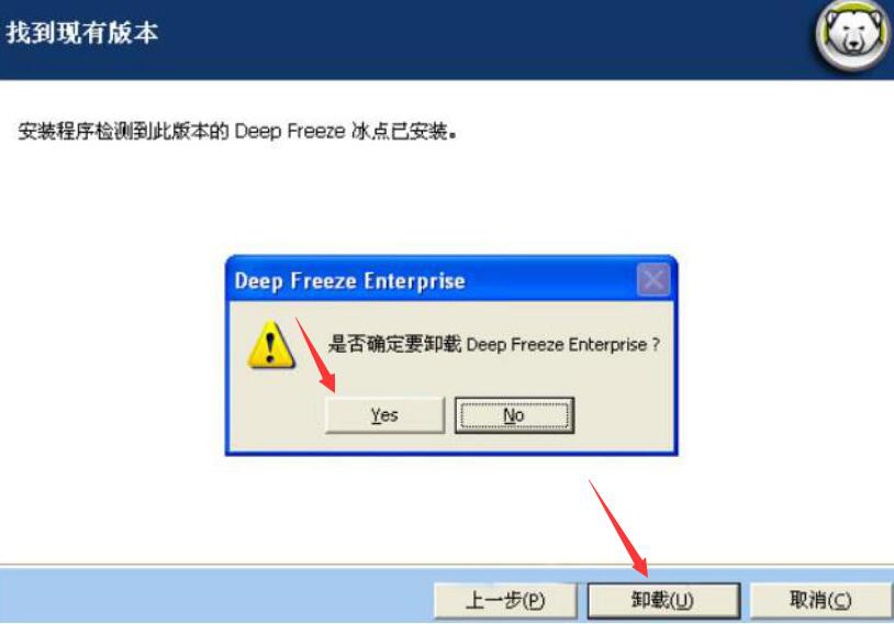3、此时,电脑便会弹出如下图的窗口提示,点击“Yes”按钮,将原来的冰点还原精灵卸载。