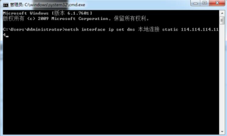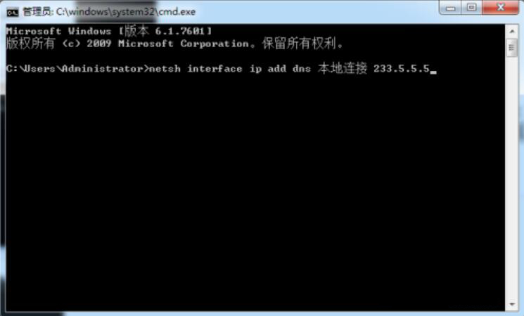 2、然后,在cmd的命令行中,键入“netsh interface ip set dns 本地连接 static 114.114.114.114”,之后再键入“netsh interface ip add dns 本地连接 233.5.5.5”。