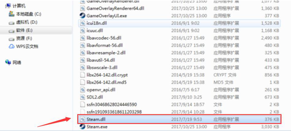 4、如果Steam社区还是打不开,依然显示102错误,可以将Steam关闭,找到Steam文件夹存放路径。在其路径下找到“Steam.dll”,并将该文件右键删除。