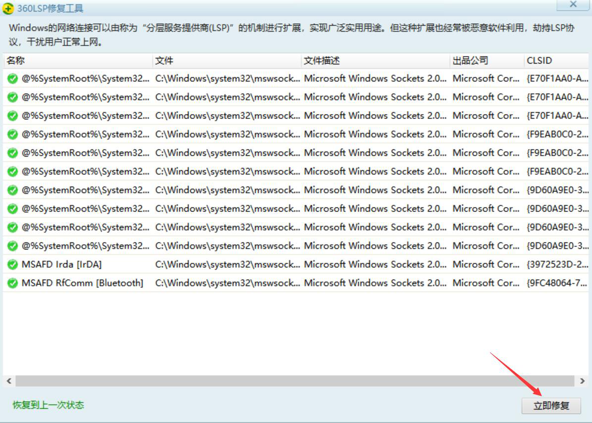 2、在“LSP修复”页面中,直接右下角的“立即修复”按钮,即可解决Steam闪退的问题。
