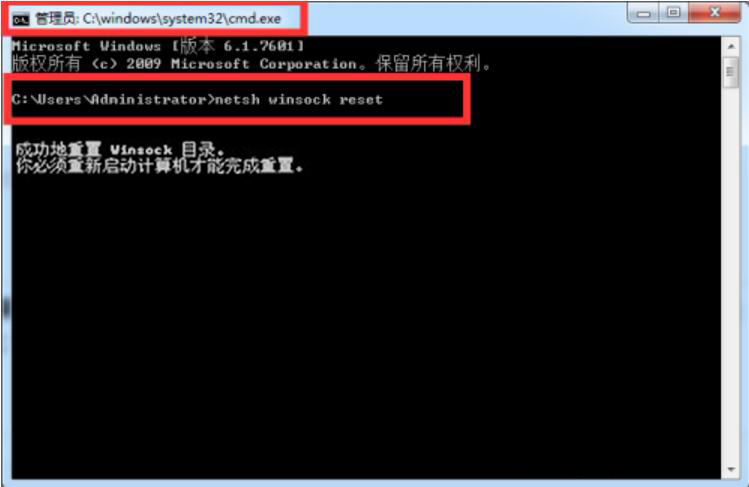 2、在打开的cmd命令行中,参考下图,在适当的位置输入“netsh winsock reset”来重置LSP命令。提示Winsock目录重置成功,将电脑重启就不会出现Steam闪退的情况了。