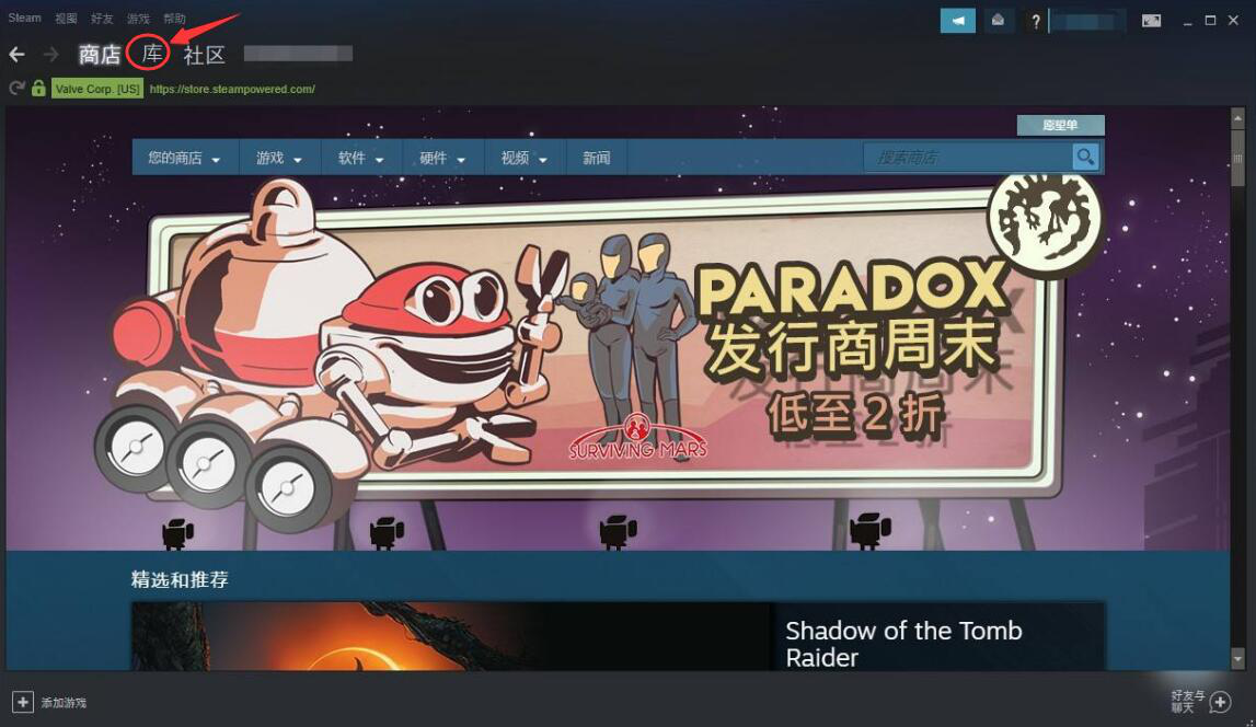 1、用户先登录Steam,在主界面中点击左上方的“库”。